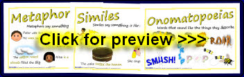 5 printable posters showing examples of different elements of text: metaphors, similes, adjectives, adverbs and onomatopoeias.
