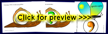 A fun set of printable snails and butterflies featuring the common punctuation marks. Snails show the marks that rest on the line and butterflies show the marks that fly in the air.