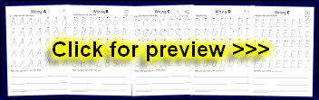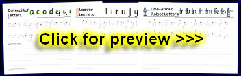 Printable trace and write sheets with alphabet letters grouped into ‘caterpillar letters’, ‘ladder letters’, ‘one-armed robot letters’ and ‘zigzag monster letters’.