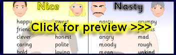 Printable nice and nasty faces featuring adjectives and adverbs to help children describe their characters and the way they talk.