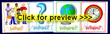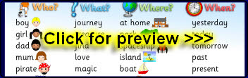 Some simple printable cards with who, what, where and when words and accompanying pictures. Ideal as prompts for children to consider when writing fiction.