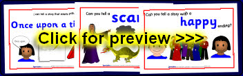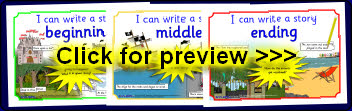 3 colourful posters to act as visual prompts when discussing story beginnings, middles and ends.