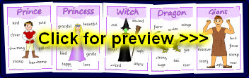 A set of A4 printable posters showing common fairytale characters along with useful words for story-telling.