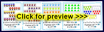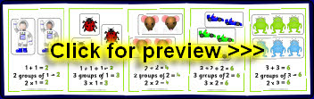 A set of 10 playdough mats where children make groups of objects as a means of demonstrating simple multiplication. They can make 2 groups of 2 potatoes on plates, 6 groups of 2 frogs on lilies, 3 groups of 4 ladybirds on leaves and more.