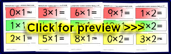 Simple flash cards showing multiplication number sentences for the 1 to 10 times tables.