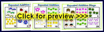 Printable bingo boards with sets of objects and repeated addition number sentence cards to match.
