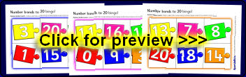 A set of bingo boards and matching cards with number bonds to make 20 on jigsaw pieces. The jigsaws do not match by colour to encourage children to focus on the number bonds themselves.