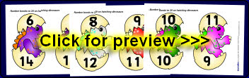 A set of printable dinosaurs hatching from eggs with number bonds making 20.