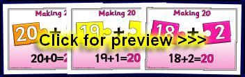A set of printable cards with number bonds to make 20. Cards can be paired by matching the animal pictures.