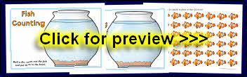 Printable desktop activity mats where children roll a dice/pick a card and place that number of fish in the bowl.