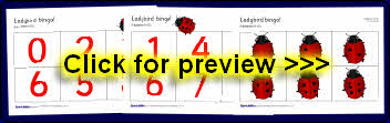 A simple bingo game designed to help with counting and recognition of numbers 0-10. Includes 6 printable bingo boards and a set of ladybird cards where each ladybird has a different number of spots (0-10).