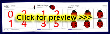 A simple bingo game designed to help with counting and recognition of numbers 0-5. Includes 6 printable bingo boards and a set of ladybird cards where each ladybird has a different number of spots (0-5)