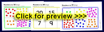 A set of bingo boards and cards where pupils match the numbers (0-20) to the corresponding picture sets.