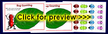 Printable desktop activity mats where children roll a dice/pick a card and place that number of bugs on the leaf.