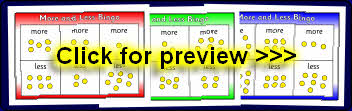 A set of printable bingo boards and cards where children match together the cards with more/less to the spaces on their board.