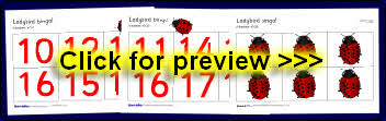 A bingo game designed to help with counting and recognition of numbers 10-20. Includes 6 printable bingo boards and a set of ladybird cards where each ladybird has a different number of spots (10-20).