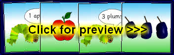 Printable cards related to the popular story. Each card is 15cm x 15cm, including separate number cards and food cards for matching activities.