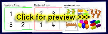Printable mini 3-piece jigsaws where children match together the tally marks, numeral and number-word to make the picture.