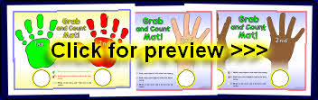 Printable desktop activity mats where children ‘grab’ objects with each hand and count to find which grabbed more/less.