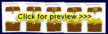 A simple printable activity where children match the numbers on the treasure chest lids to the number of coins in the chests.
