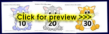 The numbers in multiples of 10 up to 100 presented on fun kitten characters.