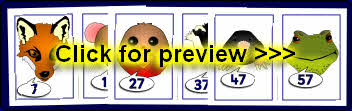 A5 flash cards featuring British wildlife characters saying numbers in 10s from 7 to 107.