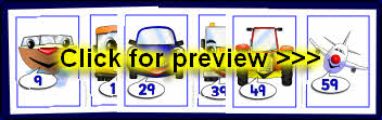 A5 flash cards featuring transport characters saying numbers in 10s from 9 to 109.