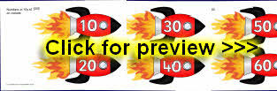 The number-words ten to one-hundred in multiples of ten on our popular rocket format.