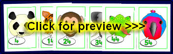 A5 flash cards featuring jungle animals saying numbers in 10s from 4 to 104.
