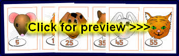 A5 flash cards featuring pet animals saying numbers in 10s from 5 to 105.