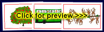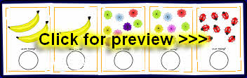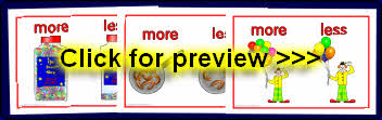 A set of 40 A4-sized flash cards showing more and less pictures. Includes images of apples on a tree, monkeys hanging from a branch, cakes on a plate, sweets in a jar and many more.