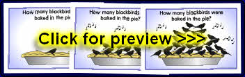 A set of 30 A4-sized posters linked to the nursery rhyme ‘Sing a Song of Sixpence...’, showing blackbirds from 1-30 in a pie. Great as visual aids for counting and estimation.