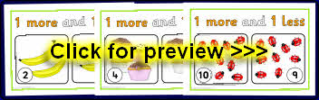 A set of posters featuring groups of objects with 1 more and 1 less for children to count and compare.