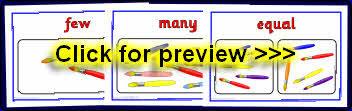 Printable posters featuring sets of objects with few, many and equal amounts.