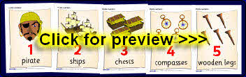 A set of A4 printable posters with numbers 1-10 and pictures with a pirate theme.