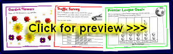 A set of visual aids and worksheets for data handling in Year 4. Includes activities related to traffic survey, Premier League football scorers, garden flowers and coins in a piggy bank. Includes activities using frequency charts and pictograms.