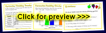 A set of visual aids for data handling in Year 3. Includes a survey of a class’ favourite healthy snack and questions relating to a tally chart and bar graph.