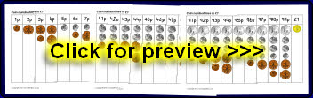 Printable number tracks from 1p to £1, showing the best coin combinations to make each amount.
