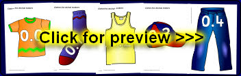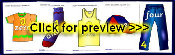 The numbers from 0 to 50 presented on various types of clothes. Great for use on a hanging classroom number line or in a role-play area.