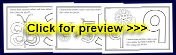 Simple printable pages focusing on the numbers 3, 5 and 9 which children can sometimes write reversed. Pupils trace over the numbers with rainbow colours and colour the picture.
