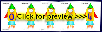 The numerals 0 up to 50 presented on colourful A4-sized rockets.