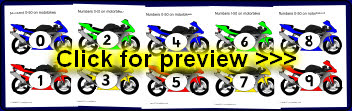 The numbers from 0 to 50 presented on coloured motorbikes.