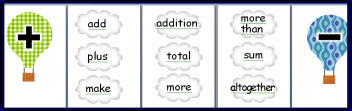Colourful display showing different maths vocab for addition, subtraction etc. +/-/x etc on hot air balloons, vocab on clouds. Word document - fully editable.