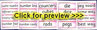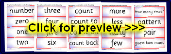 A set of printable cards featuring the mathematical vocabulary for ‘Counting and recognising numbers’ to be used in Reception.