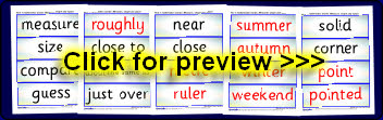 A set of printable cards featuring the mathematical vocabulary for ‘Measures, shape and space’ to be used in Year One.