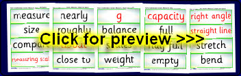 A set of printable cards featuring the mathematical vocabulary for ‘Measures, shape and space’ to be used in Year Two.