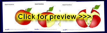A set of printable visual aids to help explain basic fractions to your class. The apple is cut into quarters and halves.