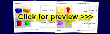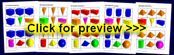 A set of double-sided printable flash cards (4-to-a-page) showing common 3D shapes. The shape names can be printed on the reverse of each card.