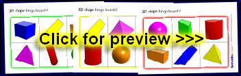 A set of 6 printable A4-sized bingo boards featuring colourful 3D shapes.