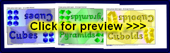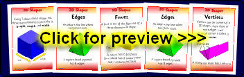 A colourful set of printable posters with information about 3D shapes. They explain the properties of 3D shapes such as faces, indices and how they are measured, together with fact and question sheets about prisms and polyhedrons.